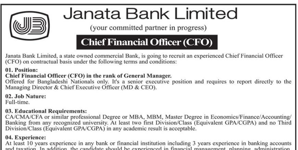 জনতা ব্যাংক নিয়োগ বিজ্ঞপ্তি ২০২২ঃ জনতা ব্যাংক আবারো নতুন নিয়োগ বিজ্ঞপ্তি ২০২২ প্রকাশ করেছে। জনতা ব্যাংক লিমিটেড, একটি রাষ্ট্রীয় মালিকানাধীন বাণিজ্যিক ব্যাংক, নিম্নলিখিত শর্তাবলীর অধীনে চুক্তি ভিত্তিতে একজন অভিজ্ঞ চিফ ফাইন্যান্সিয়াল অফিসার (সিএফও) নিয়োগ করতে যাচ্ছে।