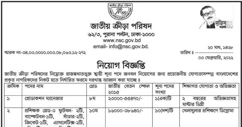 জাতীয় ক্রীড়া পরিষদ নিয়োগ বিজ্ঞপ্তি