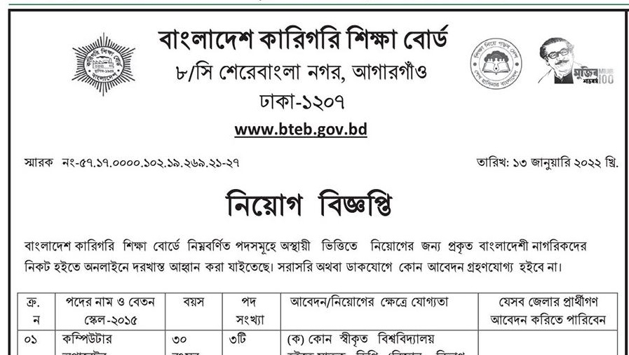 বাংলাদেশ কারিগরি শিক্ষা বোর্ড নিয়োগ বিজ্ঞপ্তি ২০২২ঃ বাংলাদেশ কারিগরি শিক্ষা বোর্ড আবারো নতুন নিয়োগ বিজ্ঞপ্তি ২০২২ প্রকাশ করেছে।বাংলাদেশ কারিগরি শিক্ষা বোর্ডে নিম্নবর্ণিত পদসমূহে অস্থায়ী ভিত্তিতে নিয়োগের জন্য প্রকৃত বাংলাদেশী নাগরিকদের নিকট হইতে অনলাইনে দরখাস্ত আহ্বান করা যাইতেছে। সরাসরি অথবা ডাকযোগে কোন আবেদন গ্রহণযোগ্য হইবে না।