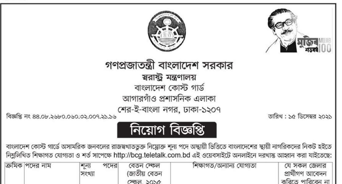 বাংলাদেশ কোস্ট গার্ড নিয়োগ বিজ্ঞপ্তি ২০২১ঃ বাংলাদেশ কোস্ট গার্ড নতুন নিয়োগ বিজ্ঞপ্তি ২০২১ প্রকাশ করেছে। বাংলাদেশ কোস্ট গার্ডে অসামরিক জনবলের রাজস্বখাতভুক্ত নিম্নোক্ত শূন্য পদে অস্থায়ী ভিত্তিতে বাংলাদেশের স্থায়ী নাগরিকদের নিকট হইতে নিম্নলিখিত শিক্ষাগত যোগ্যতা ও শর্ত সাপেক্ষে http://bcg.teletalk.com.bd এই ওয়েবসাইটে অনলাইনে দরখাস্ত আহ্বান করা যাইতেছে।