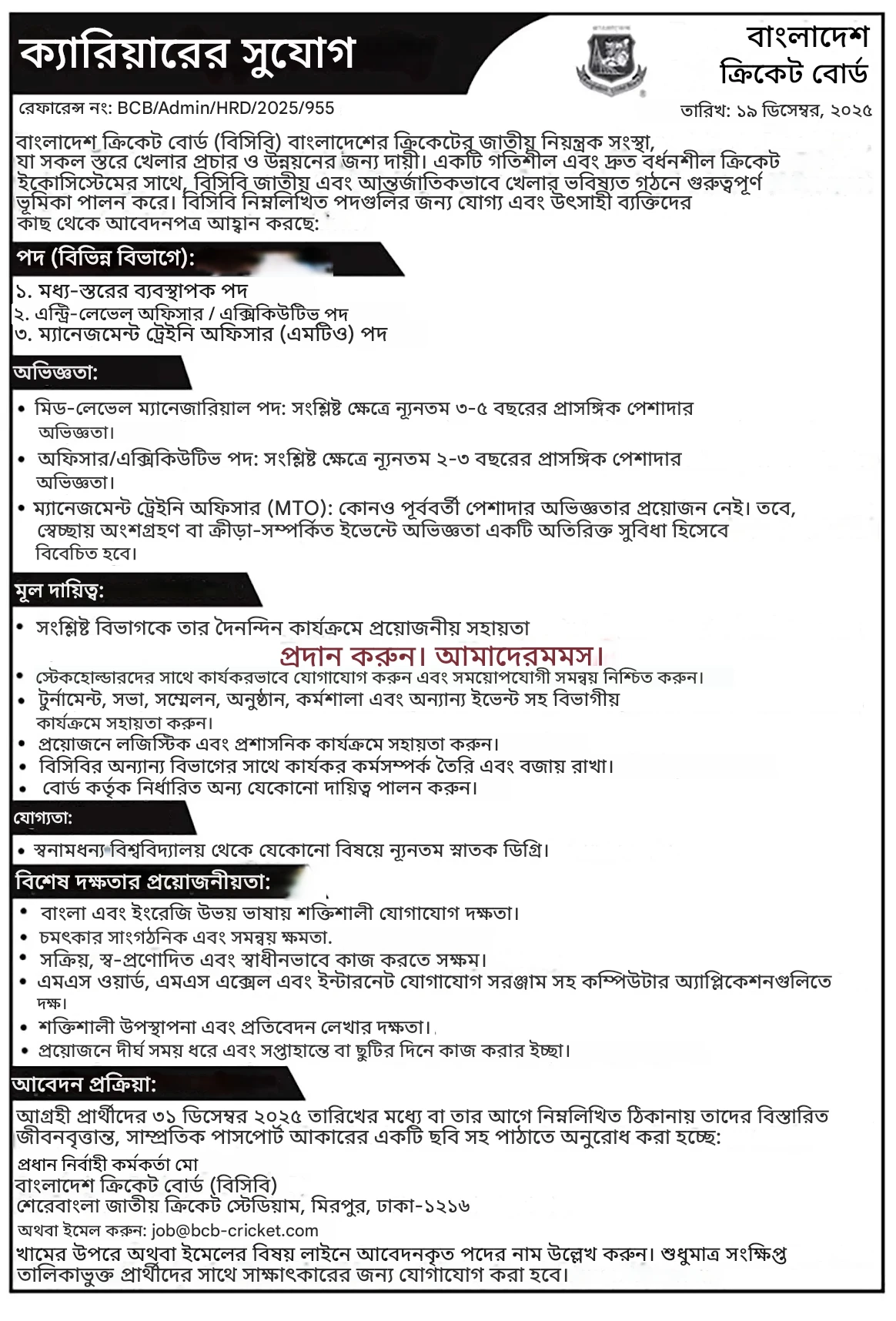 বাংলাদেশ ক্রিকেট বোর্ডের চাকরির বিজ্ঞপ্তি ২০২৫ পিডিএফ / ছবি