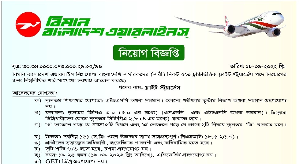 বিমান বাংলাদেশ এয়ারলাইন্স নিয়োগ বিজ্ঞপ্তি ২০২২ -Biman Bangladesh Airlines Job Circular 2022: বিমান বাংলাদেশ এয়ারলাইন লিস যোগ্য বাংলাদেশি নাগরিকদের (নারী) নিতে চুক্তিভিকি ইয়ার্ডস পদে নিয়োগের জন্য নিম্নলিখিত শর্ত সাপেক্ষে দরখাস্ত আহ্বান করছে।