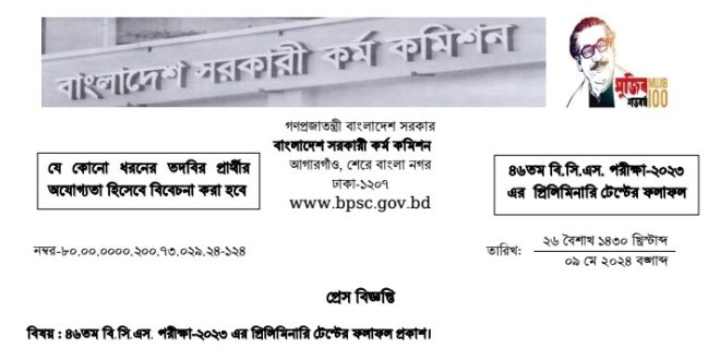 বিসিএস প্রিলিমিনারি পরীক্ষার ফলাফল ২০২৪ প্রেস বিজ্ঞপ্তি বিষয়: ৪৬ভম বি.সি.এস. পরীক্ষা-২০২৩ এর প্রিলিমিনারি টেস্টের ফলাফল প্রকাশ। গত ২৬.০৪.২০২৪ তারিখে অনুষ্ঠিত ৪৬তম বি.সি.এস. পরীক্ষা-২০২৩ এর প্রিলিমিনারি টেস্টে অংশগ্রহণকারী প্রার্থীদের মধ্যে বাংলাদেশ সিভিল সার্ভিস (বয়স, যোগ্যতা ও সরাসরি নিয়োগের জন্য পরীক্ষা) বিধিমালা।