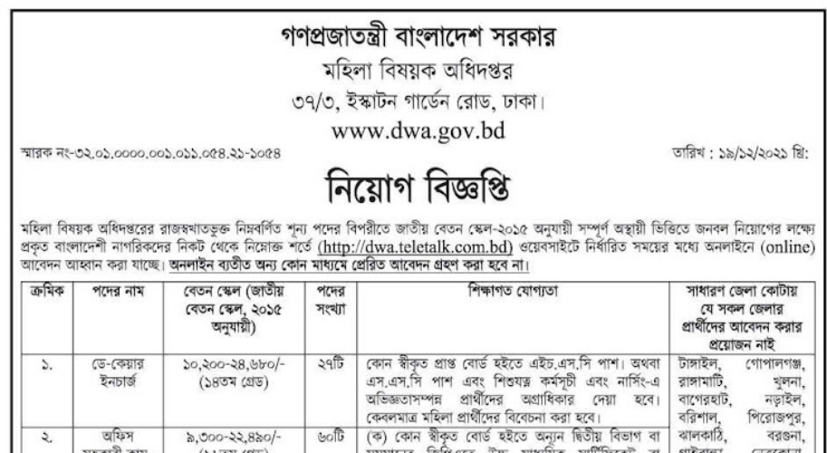 মহিলা বিষয়ক অধিদপ্তর নিয়োগ বিজ্ঞপ্তি ২০২২ঃ মহিলা বিষয়ক অধিদপ্তর আবারো নতুন নিয়োগ বিজ্ঞপ্তি ২০২১ প্রকাশ করেছে। মহিলা বিষয়ক অধিদপ্তরের রাজস্বখাতভূক্ত নিম্নবর্ণিত শূন্য পদের বিপরীতে জাতীয় বেতন স্কেল ২০১৫ অনুযায়ী সম্পূর্ণ অস্থায়ী ভিত্তিতে জনবল নিয়োগের লক্ষ্যে প্রকৃত বাংলাদেশী নাগরিকদের নিকট থেকে নিম্নোক্ত শর্তে (http://dwa.teletalk.com.bd) সাইটে নির্ধারিত সময়ের মধ্যে অনলাইনে (online)আবেদন আহ্বান করা যাচ্ছে। অনলাইন ব্যতীত অন্য কোন মাধ্যমে প্রেরিত আবেদন গ্রহণ করা হবে না।