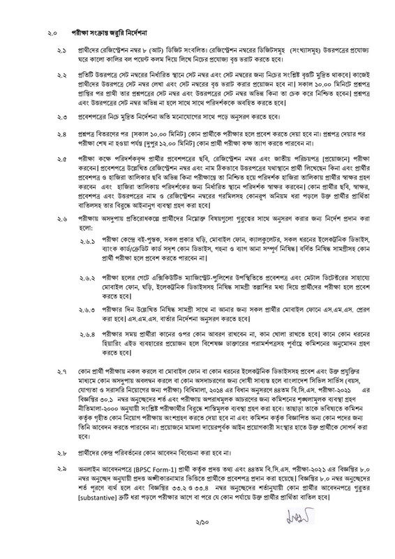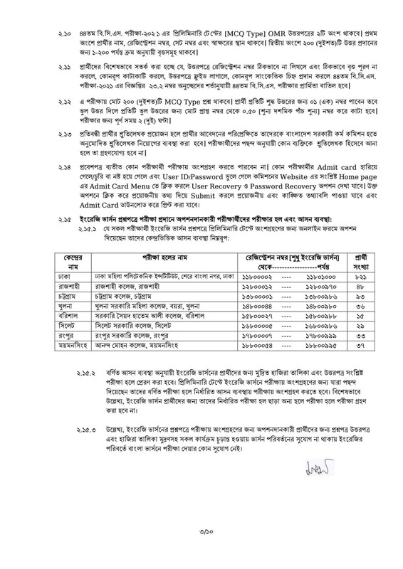 প্রয়োজনে মামলা দায়েরপূর্বক আইন প্রয়োগকারী সংস্থার হাতে উক্ত প্রার্থীকে সোপর্দ করা হবে। এর প্রার্থীদের কেন্দ্র পরিবর্তনের কোন আবেদন বিবেচনা করা হবে না। ২.৯ অনলাইন আবেদনপত্রে (BPSC Form-1] প্রার্থী কর্তৃক প্রদত্ত তথ্য এবং ৪৪তম বি.সি.এস. পরীক্ষা-২০২১ এর বিজ্ঞপ্তির ৮.০ নম্বর অনুচ্ছেদ অনুযায়ী প্রদত্ত অঙ্গীকারনামার ভিত্তিতে প্রার্থীকে প্রবেশপত্র প্রদান করা হয়েছে। বিজ্ঞপ্তির ৮.০ নম্বর অনুচ্ছেদের শর্ত পূরণে ব্যর্থ হলে এবং বিজ্ঞপ্তির ৩৩.২ ও ৩৩.৪ নম্বর অনুচ্ছেদের শর্তানুযায়ী কোন প্রার্থীর আবেদনপত্রে গুরুতর [substantive] ত্রুটি ধরা পড়লে পরীক্ষার আগে বা পরে যে কোন পর্যায়ে উক্ত প্রার্থীর প্রার্থিতা বাতিল হবে।