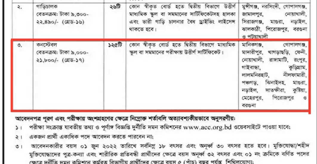 পরীক্ষা সংক্রান্ত যাবতীয় তথ্য ও পূর্ণাঙ্গ বিজ্ঞপ্তি দুর্নীতি দমন কমিশনের www.acc.org.bd ওয়েবসাইটে পাওয়া যাবে একজন প্রার্থী একাধিক পদে আবেদন করতে পারবেন না। আবেদনকারীর বয়স ০১ জুন ২০২২ তারিখে সর্বনিম্ন ১৮ বৎসর এবং অনূর্ধ্ব ৩০ বৎসর হতে হবে।