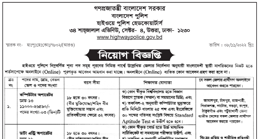 বাংলাদেশ হাইওয়ে পুলিশ নিয়োগ বিজ্ঞপ্তি