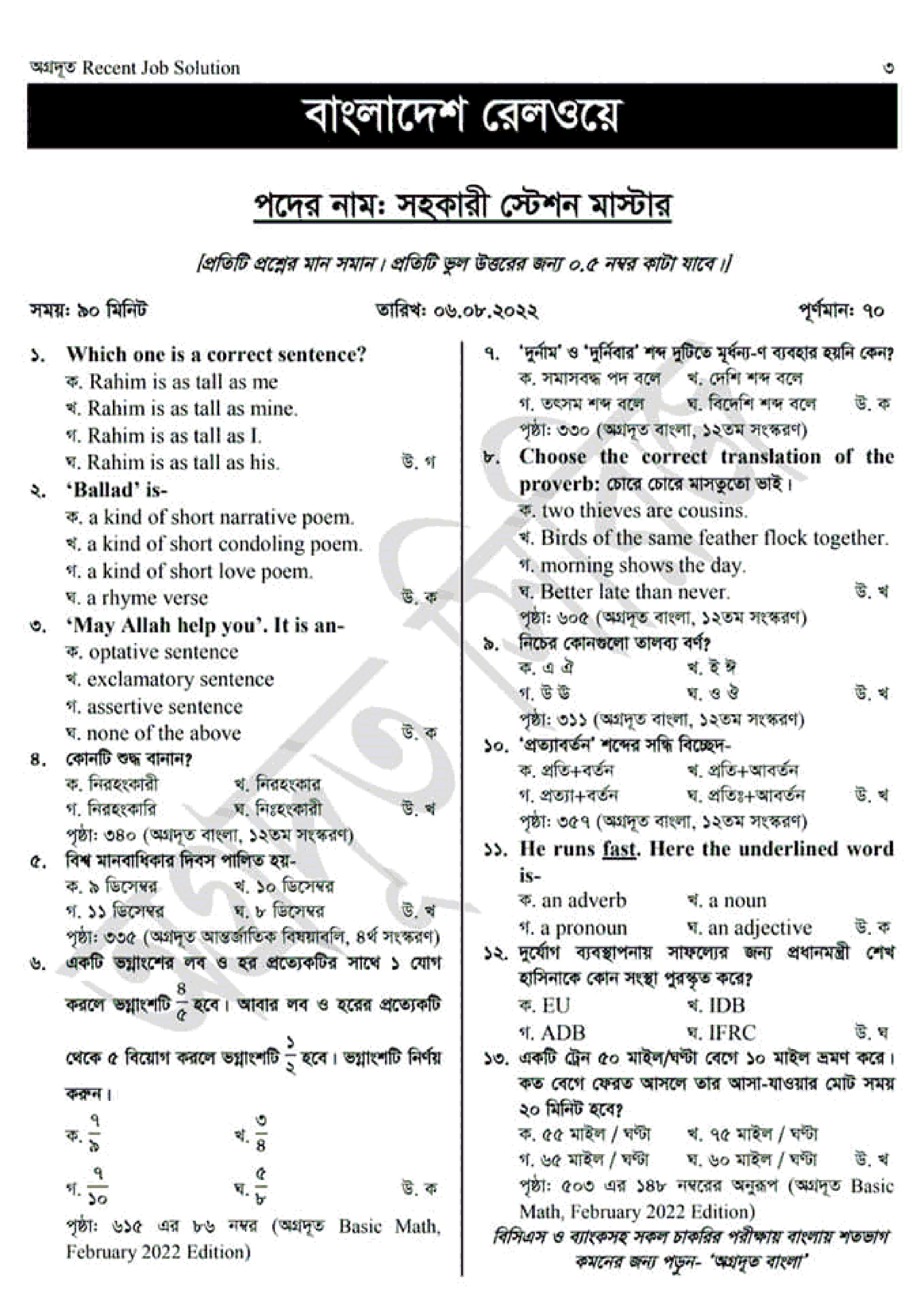 বাংলাদেশ রেলওয়ে সহকারী স্টেশন মাস্টার পরীক্ষার প্রশ্ন সমাধান