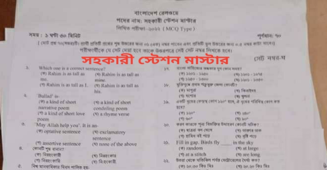 বাংলাদেশ রেলওয়ে সহকারী স্টেশন মাস্টার পরীক্ষার প্রশ্ন