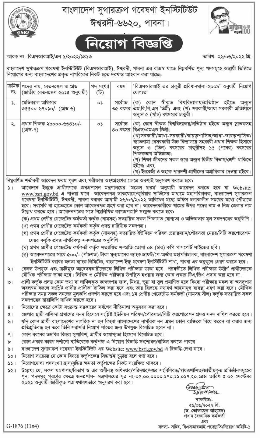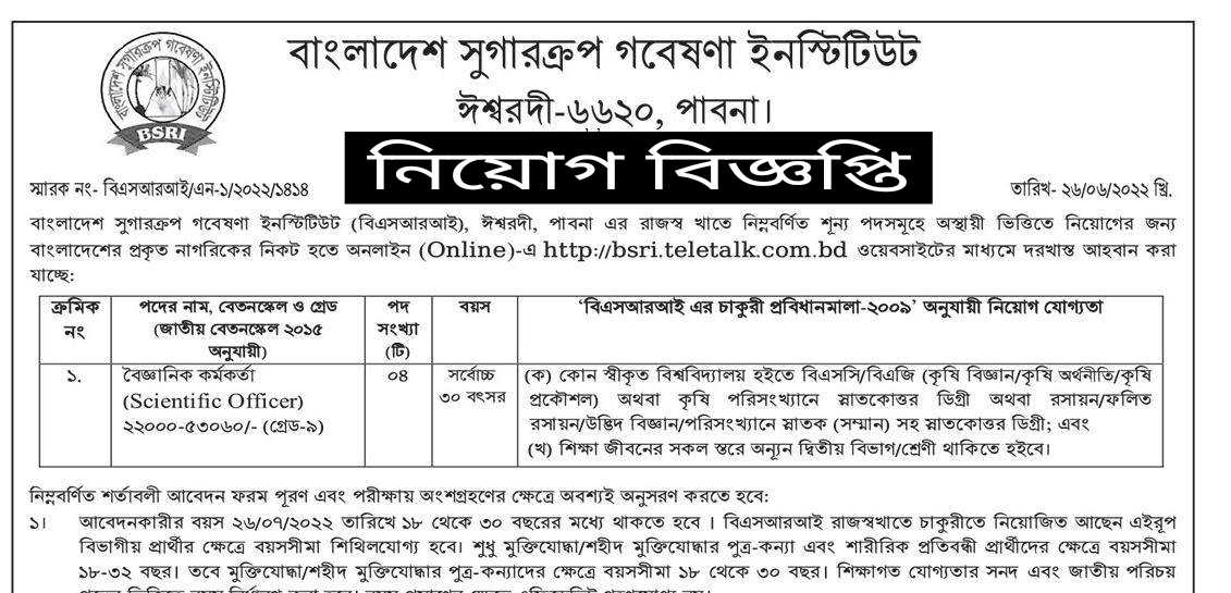 বাংলাদেশ সুগারক্রপ গবেষণা ইনস্টিটিউট নিয়োগ বিজ্ঞপ্তি ২০২২ঃ বাংলাদেশ সুগাররূপ গবেষণা ইনস্টিটিউট (বিএসআরআই), ঈশ্বরদী, পাবনা এর রাক্ষস থাকে নিম্নবর্ণিত শূন্য পদসমূহে অস্থার ভিত্তিতে নিয়োগের জন্য বাংলাদেশের প্রকৃত নাগরিকের নিকট হতে অনলাইন (Online)-এ http://bsri.teletalk.com.bd ওয়েবসাইটের মাধ্যমে দরখাস্ত আহবান করা যাচ্ছে।