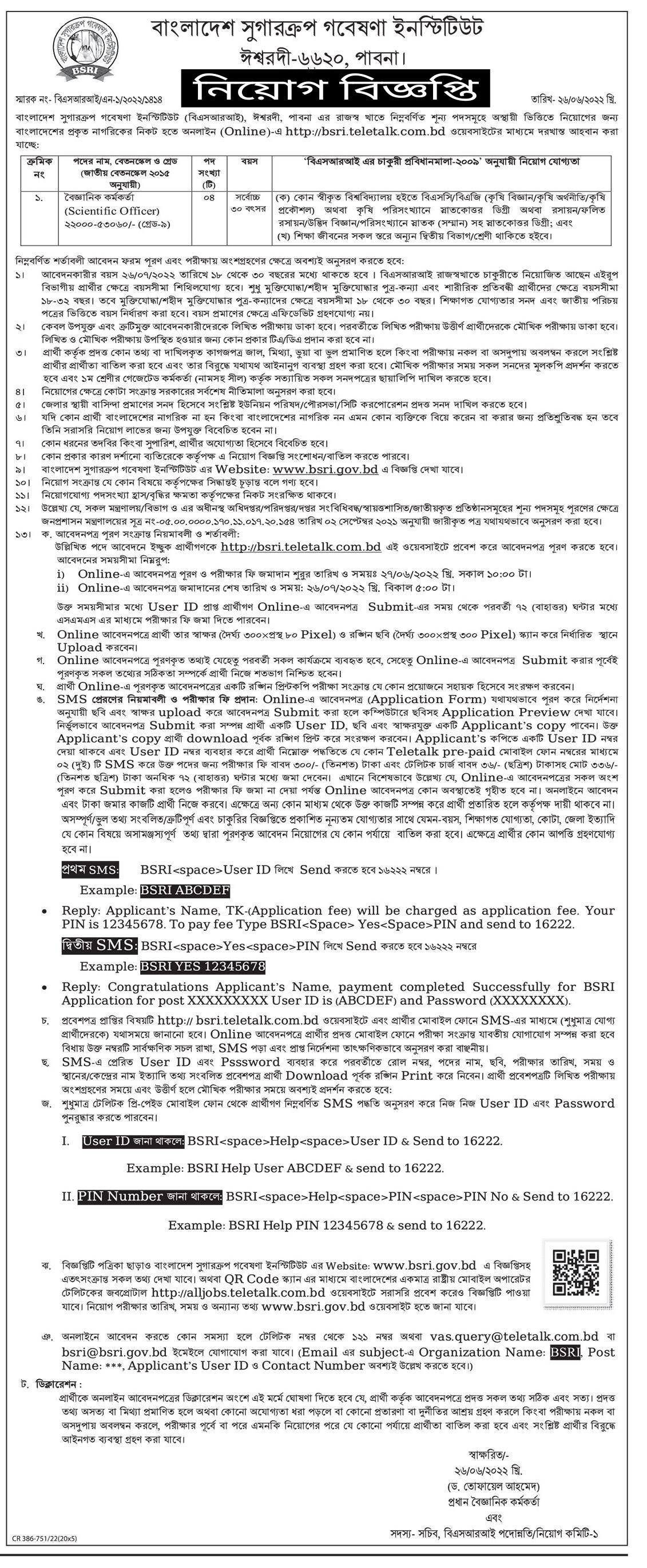 আবেদন প্রক্রিয়াঃ আবেদনে ইচ্ছুক প্রার্থীগণকে জনপ্রশাসন মন্ত্রণালয়ের ‘মডেল ফরম’ অনুযায়ী আবেদন করতে হবে যা Website: www.bsri.gov.bd এ পাওয়া যাবে। আবেদনপত্র ডাকযোগে/কুরিয়ার সার্ভিসের মাধ্যমে মহাপরিচালক, বাংলাদেশ সুগারক্রপ গবেষণা ইনস্টিটিউট, ঈশ্বরদী, পাবনা বরাবর আগামী ২৬/০৭/২০২২ তারিখের মধ্যে অফিস চলাকালীন সময়ের মধ্যে পৌঁছাতে হবে।
