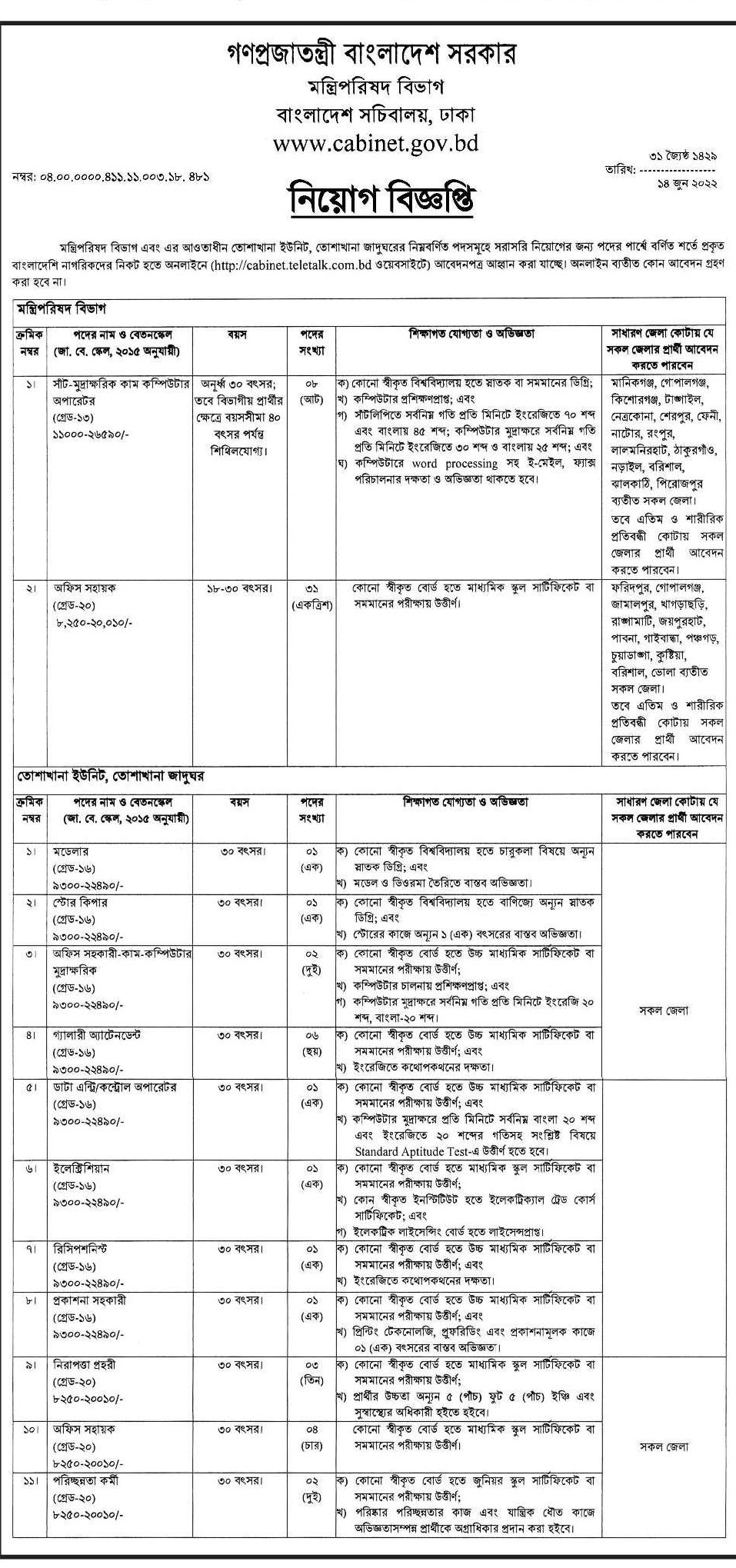 মন্ত্রিপরিষদ বিভাগ নিয়োগ বিজ্ঞপ্তি ২০২২ঃ মন্ত্রিপরিষদ বিভাগ এবং এর আওতাধীন তোশাখন ইউনিট, তোশাখানা জাদুঘরের নিম্নবর্ণিত পদসমূহে সরাসরি নিয়োগের জন্য পদের পার্শ্বে বর্ণিত শ প্রকৃত বাংলাদেশি নাগরিকদের নিকট হতে অনলাইনে (http://cabinet.teletalk.com.bd ওয়েবসাইটে) আবেদনপত্র আহ্বান করা যাচ্ছে। অনলাইন বার্তীত কোন আবেদন গ্রহণ করা হবে না।