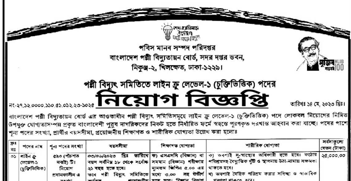 বিদ্যুৎ বিভাগ নিয়োগ বিজ্ঞপ্তি ২০২৩ -(Bidyut Division Job Circular 2023): নিয়োগ বিজ্ঞপ্তিটিতে ৫৯০ জনকে দিবে নিয়োগ বিদ্যুৎ বিভাগ। বাংলাদেশ পল্লী বিদ্যুতায়ন বোর্ড এর আওতাধীন পল্লী বিদ্যুৎ সমিতিসমূহে লাইন ক্রু লেভেল-১ (চুক্তিভিত্তিক) পদে লোকবল নিয়োগের নির্মিত উপযুক্ত যোগ্যতাসম্পন্ন প্রকৃত বাংলাদেশী পুরুষ নাগরিকদের নিকট হতে নির্ধারিত ফর্মে সহস্তে পুরণকৃত দরখাস্ত আহবান করা …