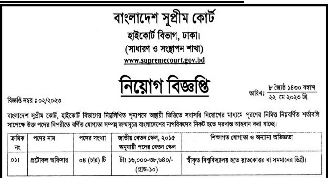 হাইকোর্ট বিভাগ নিয়োগ বিজ্ঞপ্তি ২০২৩ -(High Court Department Job Circular 2023): প্রটোকল অফিসার পদে নিয়োগ দিবে হাইকোর্ট বিভাগ। বাংলাদেশ সুপ্রীম কোর্ট, হাইকোর্ট বিভাগের নিম্নলিখিত শূন্যপদে অস্থায়ী ভিত্তিতে সরাসরি নিয়োগের মাধ্যমে পূরণের নিমিত্ত নিম্নবর্ণিত শর্তাবলি সাপেক্ষে উক্ত পদের বিপরীতে বর্ণিত যোগ্যতা সম্পন্ন জন্মসূত্রে বাংলাদেশের নাগরিকদের নিকট হতে দরখাস্ত আহবান করা যাচ্ছে। …