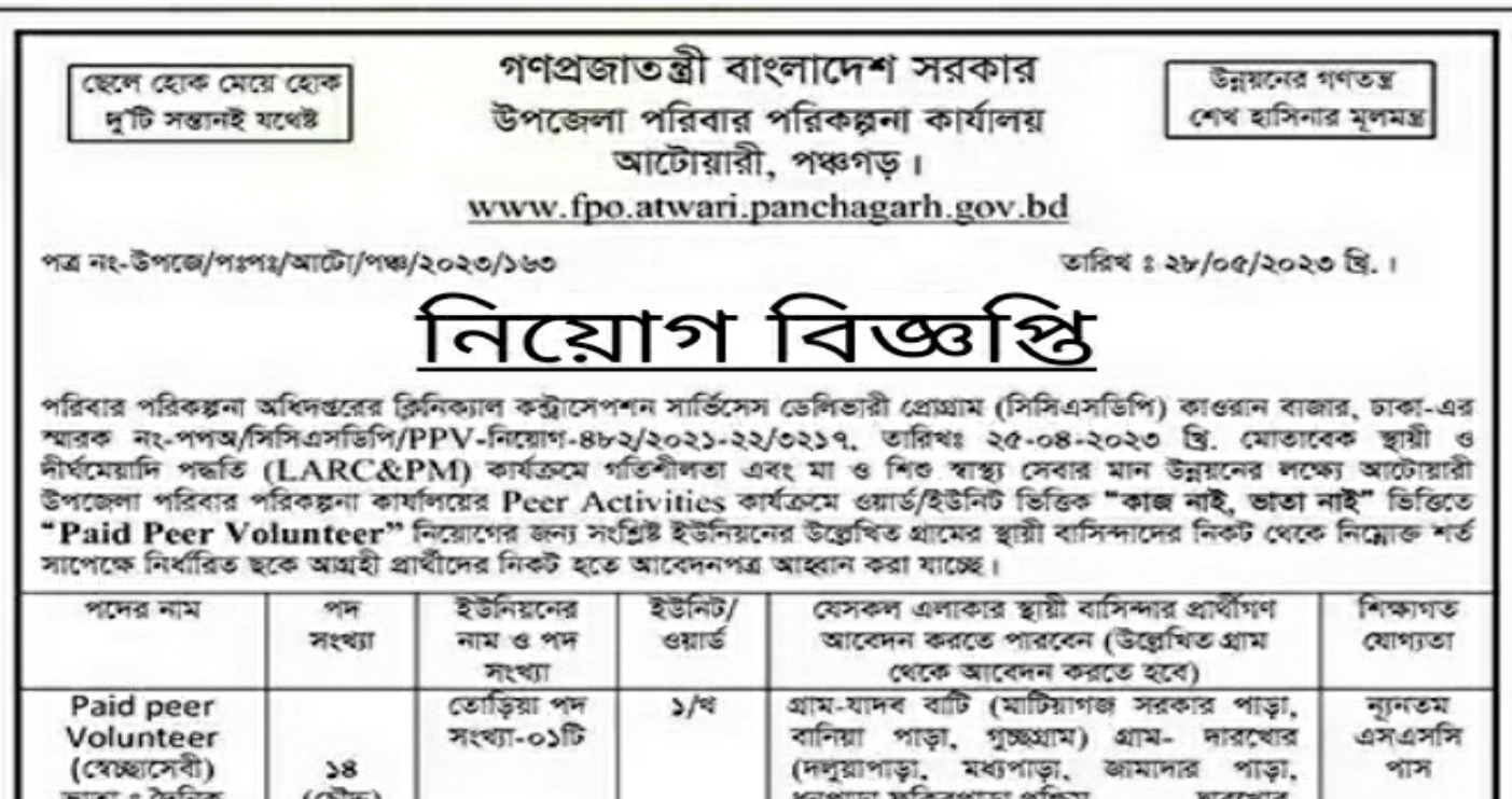উপজেলা পরিবার পরিকল্পনা কার্যালয় নিয়োগ বিজ্ঞপ্তি ২০২৩ -(Upazila Family Planning Office Job Circular 2023): Paid Peer Volunteer পদে অধীনে নির্ধারিত জেলার নিম্নবর্ণিত রাজস্বখাতভুক্ত শূন্যপদ পূরণের নিমিত্ত পদের পাশে উল্লিখিত সংশ্লিষ্ট জেলা/উপজেলা/সিটি কর্পোরেশন/ইউনিয়ন/পৌরসভা/ইউনিট/ওয়ার্ডের স্থায়ী নাগরিকদের নিকট হতে শর্ত সাপেক্ষে নির্ধারিত ছকে আবেদনপত্র আহ্বান করা যাচ্ছে। শুধুমাত্র উল্লেখিত জেলার স্থায়ী বাসিন্দারা আবেদন করতে …