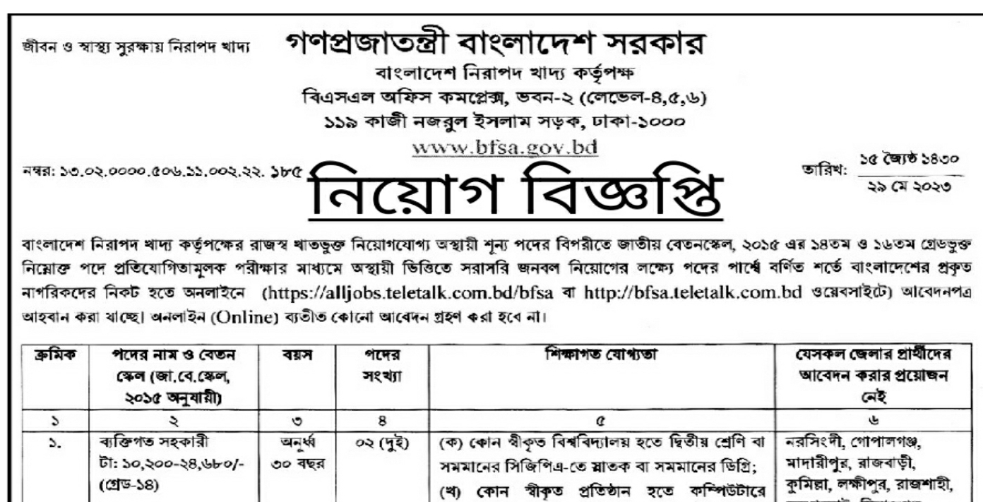 বাংলাদেশ নিরাপদ খাদ্য কর্তৃপক্ষ নিয়োগ বিজ্ঞপ্তি ২০২৩-(Bangladesh Food Safety Authority BFSA Job Circular 2023): বাংলাদেশ নিরাপদ খাদ্য কর্তৃপক্ষের রাজস্ব খাতভুক্ত নিয়োগযোগ্য অস্থায়ী শূন্য পদের বিপরীতে জাতীয় বেতনস্কেল, ২০১৫ এর ১৪তম ও ১৬তম গ্রেডভুক্ত নিম্নোক্ত পদে প্রতিযোগিতামূলক পরীক্ষার মাধ্যমে অস্থায়ী ভিত্তিতে সরাসরি জনবল নিয়োগের লক্ষ্যে পদের পার্শ্বে বর্ণিত শর্তে বাংলাদেশের প্রকৃত …