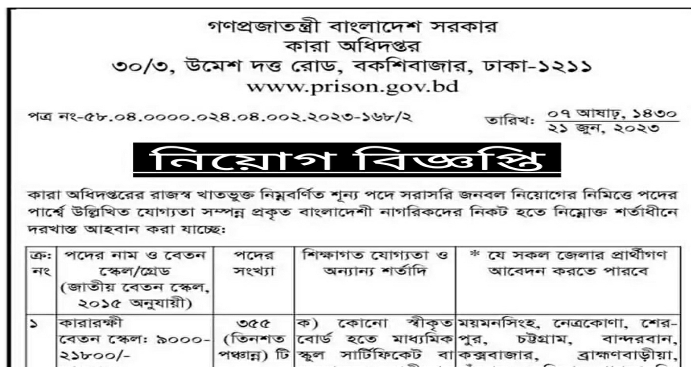 কারা অধিদপ্তর নিয়োগ বিজ্ঞপ্তি ২০২৩ -(Department of Prison Job Circular 2023): ৩৬৯ জনকে কারা অধিদপ্তর নিয়োগ বিজ্ঞপ্তি ২০২৩ প্রকাশ। কারা অধিদপ্তরের রাজস্ব খাতভুক্ত নিম্নবর্ণিত শূন্য পদে সরাসরি জনবল নিয়োগের নিমিত্তে পদের পার্শ্বে উল্লিখিত যোগ্যতা সম্পন্ন প্রকৃত বাংলাদেশী নাগরিকদের নিকট হতে নিম্নোক্ত শর্তাধীনে দরখাস্ত আহবান করা যাচ্ছে। চাকরির ধরন সরকারি চাকরি …