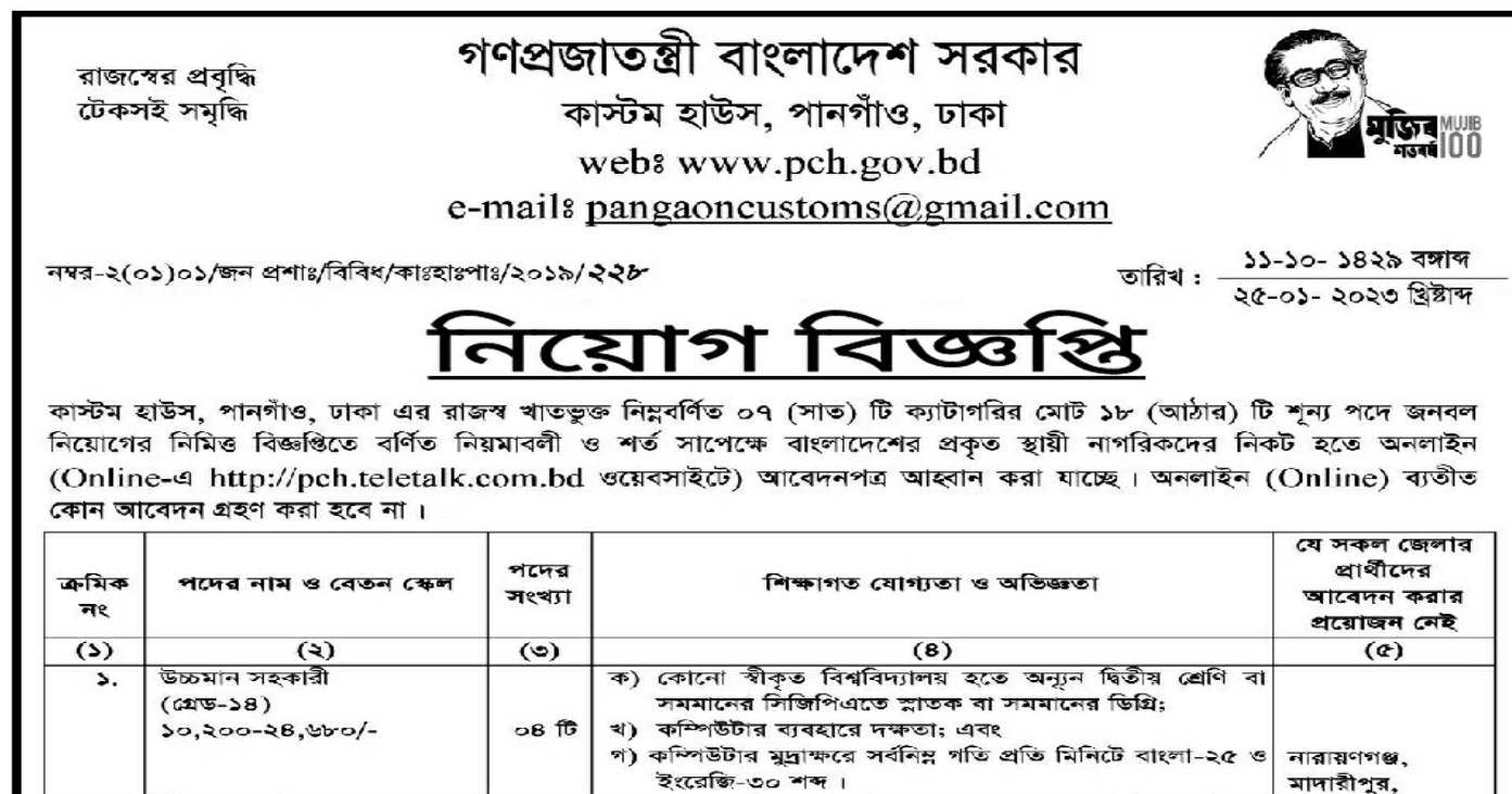 কাস্টমস হাউস পানগাঁও পিসিএইচ জব সার্কুলার 2023 কাস্টমস হাউস, পানগাঁও, ঢাকার রাজস্ব খাতের অধীনে নিম্নলিখিত 07 (সাত) বিভাগে মোট 18 (আঠার)টি শূন্যপদ, সার্কুলারে বর্ণিত নিয়ম ও শর্তাবলী সাপেক্ষে, প্রকৃত থেকে উপলব্ধ বাংলাদেশের স্থায়ী নাগরিকদের অনলাইনে – http://pch.teletalk.com.bd ওয়েবসাইট) আবেদন আমন্ত্রণ জানানো হচ্ছে। অনলাইন ছাড়া কোনো আবেদন গ্রহণ করা হবে না। …