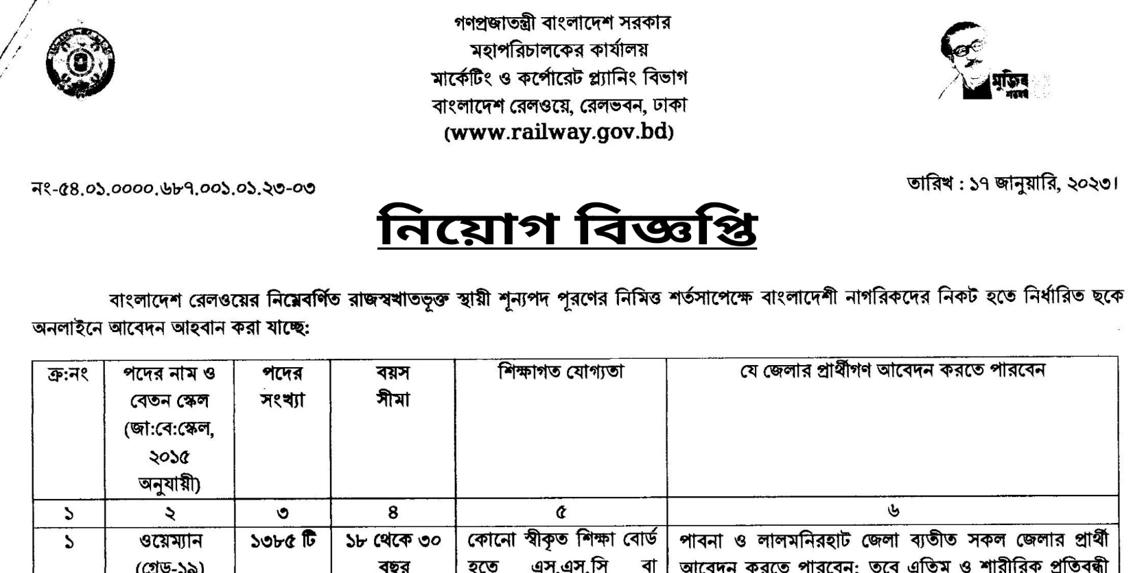 রেলওয়ে ওয়েম্যান পদে নিয়োগ বিজ্ঞপ্তি ২০২৩ -(Railway Wayman Job Circular 2023): ১৩৮৫ জনকে নিয়োগ দিবে রেলওয়ে ওয়েম্যান পদে। বাংলাদেশ রেলওয়ের নিম্নেবর্ণিত রাজস্বখাতভুক্ত স্থায়ী শূন্যপদ পূরণের নিমিত্ত শর্তসাপেক্ষে বাংলাদেশী নাগরিকদের নিকট হতে নির্ধারিত ছকে অনলাইনে আবেদন আহ্বান করা যাচ্ছে। চাকরির ধরন সরকারি চাকরি জেলা নাম উল্লেখিত জেলা পদে পাশে প্রতিষ্ঠানের দাতা …