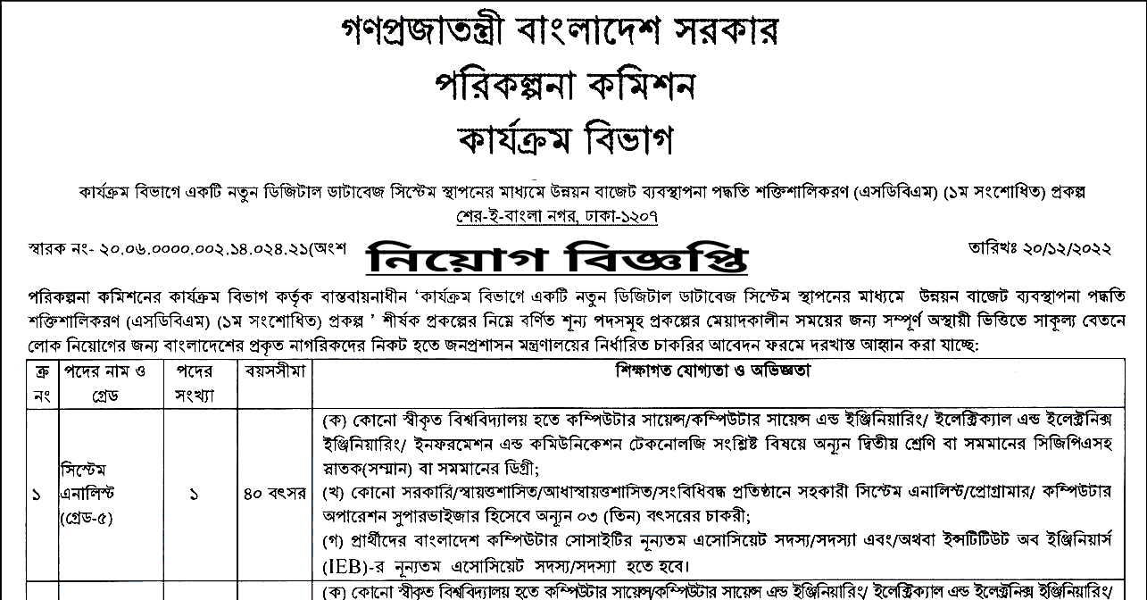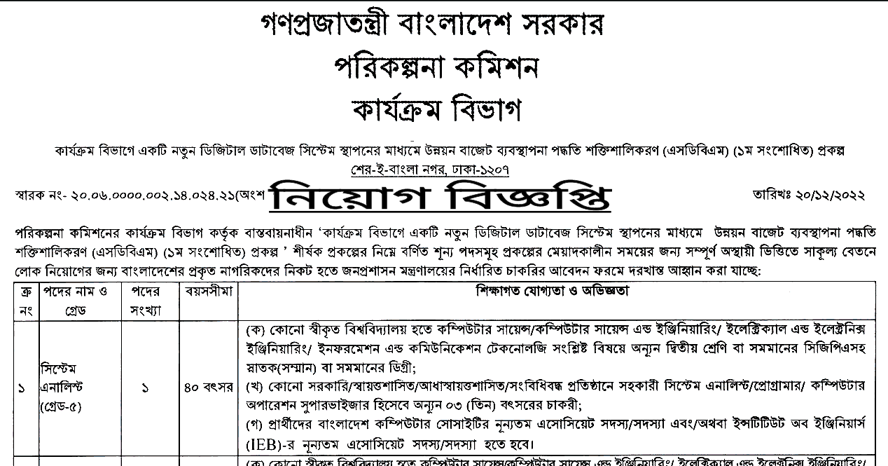 পরিকল্পনা কমিশন নিয়োগ বিজ্ঞপ্তি ২০২৩ -(Planning Commission Job Circular 2023): পরিকল্পনা কমিশনের কার্যক্রম বিভাগ কর্তৃক বাস্তবায়নাধীন ‘কার্যক্রম বিভাগে একটি নতুন ডিজিটাল ডাটাবেজ সিস্টেম স্থাপনের মাধ্যমে উন্নয়ন বাজেট ব্যবস্থাপনা পদ্ধতি শক্তিশালিকরণ (এসডিবিএম) (১ম সংশোধিত) প্রকল্প’ শীর্ষক প্রকল্পের নিম্নে বর্ণিত শূন্য পদসমূহ প্রকল্পের মেয়াদকালীন সময়ের জন্য সম্পূর্ণ অস্থায়ী ভিত্তিতে সাকূলা বেতনে সোক …