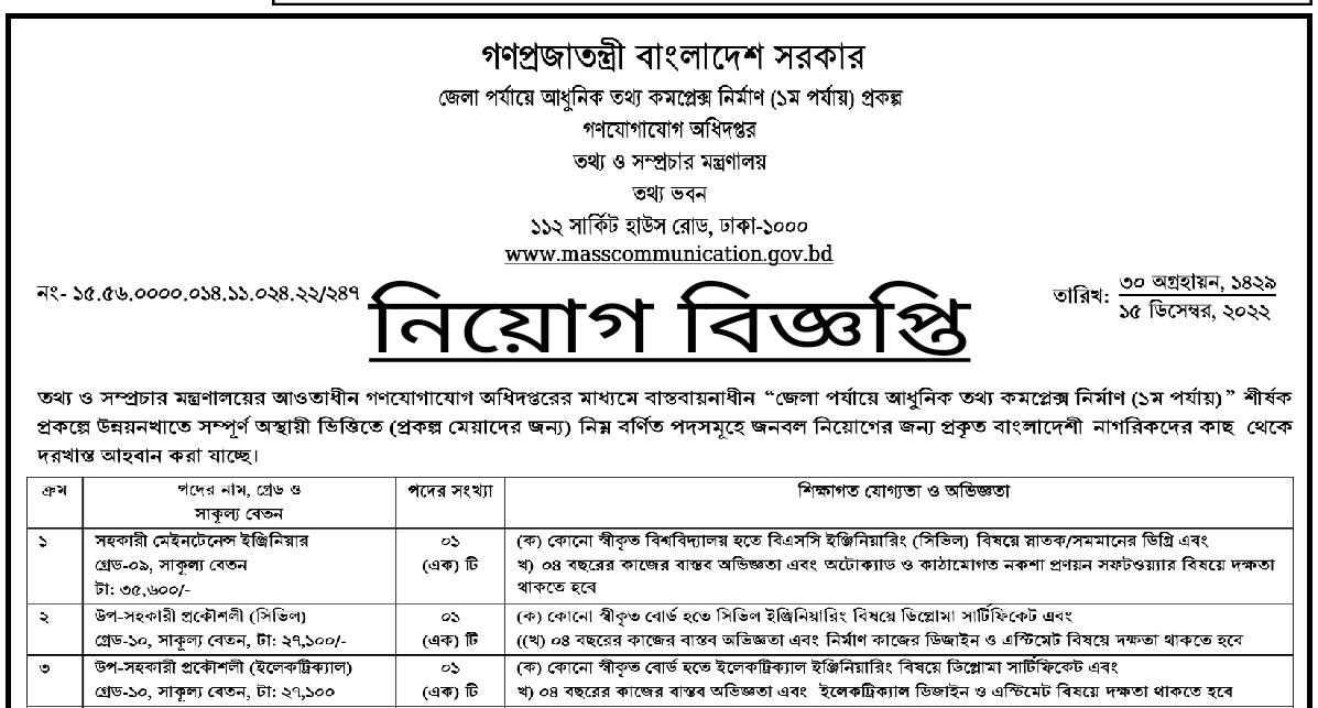 গণযোগাযোগ অধিদপ্তর নিয়োগ বিজ্ঞপ্তি ২০২৩ -(Directorate of Mass Communication MCD Job Circular 2023): তথ্য ও সম্প্রচার মন্ত্রণালয়ের আওতাধীন গণযোগাযোগ অধিদপ্তরের মাধ্যমে বাস্তবায়নাধীন “জেলা পর্যায়ে আধুনিক তথ্য কমপ্লেক্স নির্মাণ (১ম পর্যায়)” শীর্ষক প্রকল্পে উন্নয়নখাতে সম্পূর্ণ অস্থায়ী ভিত্তিতে (প্রকল্প মেয়াদের জন্য) নিম্ন বর্ণিত পদসমূহে জনবল নিয়োগের জন্য প্রকৃত বাংলাদেশী নাগরিকদের কাছ থেকে …