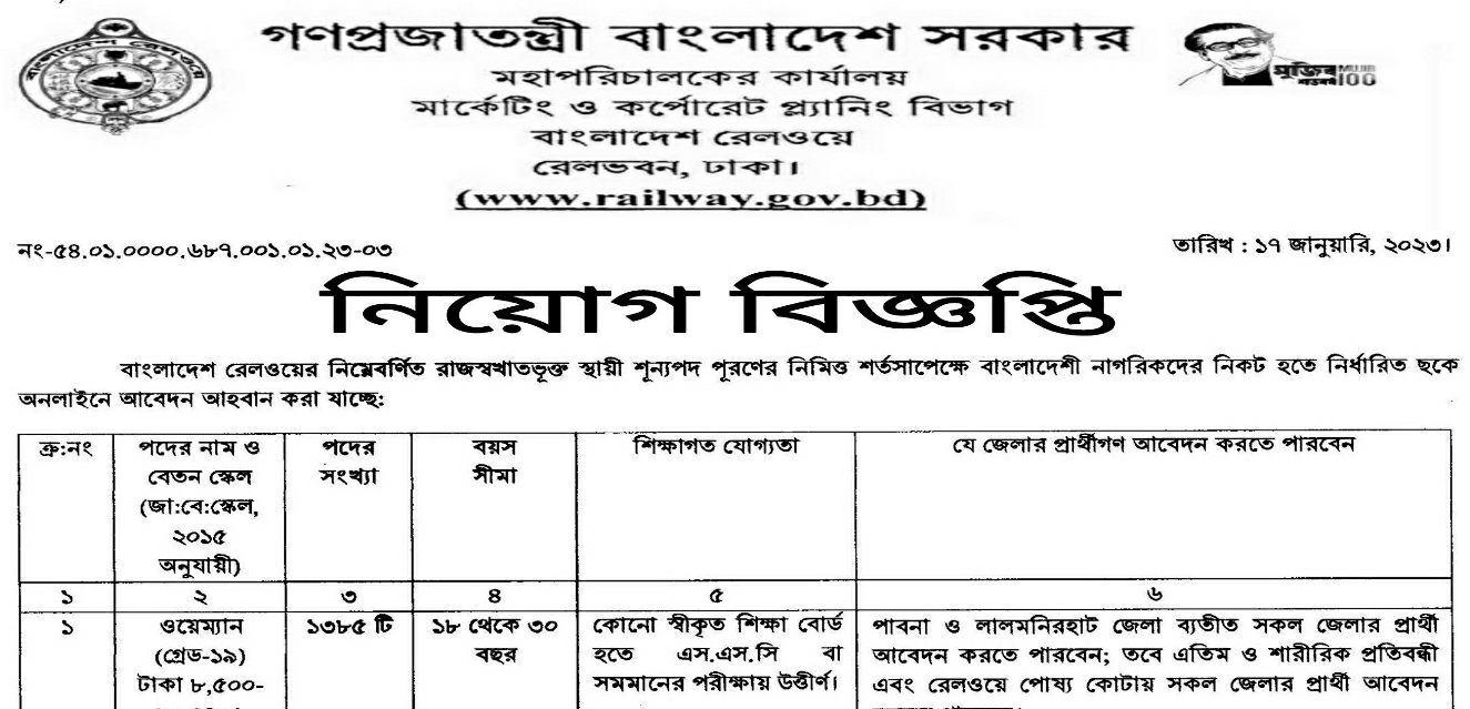 Bangladesh Railway Wayman Job Circular 2023 1385 Bangladesh Railway Wayman Recruitment Circular 2023 published. Bangladesh Railways is inviting online applications from Bangladeshi citizens in the prescribed schedule to fill up the below mentioned permanent vacancies in the revenue sector. Type of Job: Government Jobs District Name AS Per Circular Organization Name: Bangladesh …