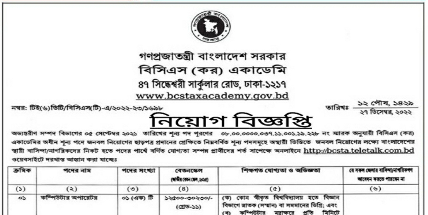 Read More »বিসিএস (কর) একাডেমি নিয়োগ বিজ্ঞপ্তি ২০২৩ | BCSTA Job Circular