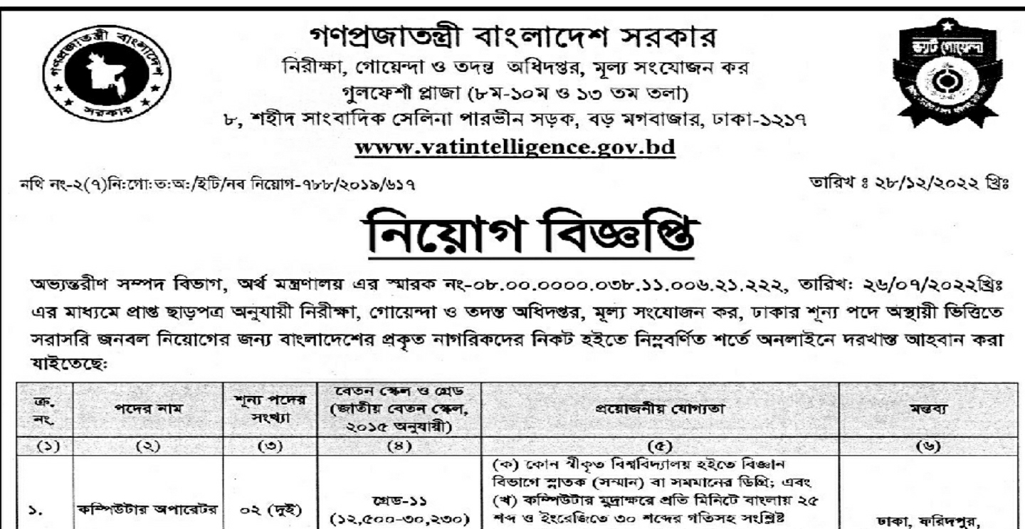 ভ্যাট গোয়েন্দা নিয়োগ বিজ্ঞপ্তি ২০২৩ – (Vat Intelligence VATAII Job Circular 2023): ভ্যাট গোয়েন্দা নিয়োগ বিজ্ঞপ্তি ২০২৩ প্রকাশ। অভ্যন্তরীণ সম্পদ বিভাগ, অর্থ মন্ত্রণালয় এর স্মারক নং-০৮.০০.০০০০.০৩৮.১১.০০৬.২১.২২২, তারিখ: ২৬/০৭/২০২২খ্রিঃ এর মাধ্যমে প্রাপ্ত ছাড়পত্র অনুযায়ী নিরীক্ষা, গোয়েন্দা ও তদন্ত অধিদপ্তর, মূল্য সংযোজন কর, ঢাকার শূন্য পদে অস্থায়ী ভিত্তিতে সরাসরি জনবল নিয়োগের জন্য …