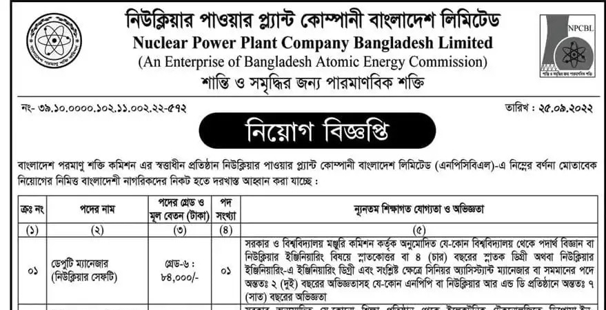 নিউক্লিয়ার পাওয়ার প্ল্যান্ট কোম্পানি নিয়োগ বিজ্ঞপ্তি ২০২২-(Nuclear Power Plant Company NPCBL Job Circular 2022): বাংলাদেশ পরমাণু শক্তি কমিশন এর স্বাধীন প্রতিষ্ঠান নিউক্লিয়ার পাওয়ার প্লান্ট কোম্পানী বাংলাদেশ লিমিটের (এনপিসিবিএল)-এ নিদ্রের বর্ণনা মোতাবেক নিয়োগের নির্মিত বাংলাদেশী নাগরিকদের নিকট হতে দরখাস্ত আহ্বান করা যাচ্ছে। প্রতিষ্ঠানের দাতা নামঃ নিউক্লিয়ার পাওয়ার প্ল্যান্ট কোম্পানি কোম্পানি বাংলাদেশ …