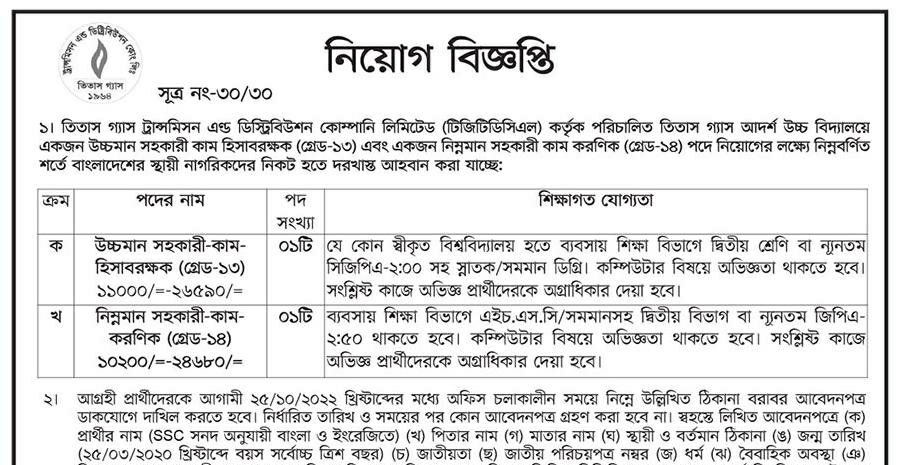 তিতাস গ্যাস ট্রান্সমিসন এন্ড ডিষ্ট্রিবিউশন কোম্পানী লিমিটেড নিয়োগ ২০২২ঃ তিতাস গ্যাস ট্রান্সমিসন এন্ড ডিস্ট্রিবিউশন কোম্পানি লিমিটেড (টিজিটিডিসিএল) কর্তৃক পরিচালিত তিতাস গ্যাস আদর্শ উচ্চ বিদ্যালয়ে একজন উচ্চমান সহকারী কাম হিসাবরক্ষক (গ্রেড-১৩) এবং একজন নিম্নমান সহকারী কাম করণিক (গ্রেড-১৪) পদে নিয়োগের লক্ষ্যে নিম্নবর্ণিত শর্তে বাংলাদেশের স্থায়ী নাগরিকদের নিকট হতে দরখাস্ত আহবান করা …