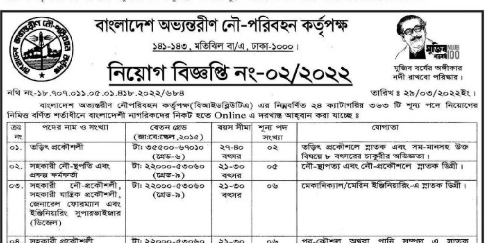 Read More »অভ্যন্তরীণ নৌ-পরিবহন কর্তৃপক্ষ নিয়োগ বিজ্ঞপ্তি ২০২২ | BIWTA Job