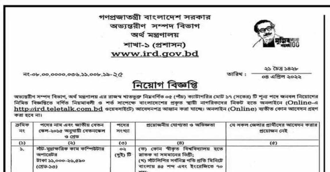Read More »অভ্যন্তরীণ সম্পদ বিভাগ নিয়োগ বিজ্ঞপ্তি ২০২২ | IRD Job Circular
