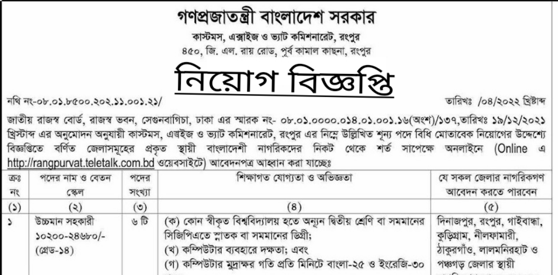 Read More »কাস্টমস এক্সাইজ ও ভ্যাট কমিশনারেট রংপুর নিয়োগ বিজ্ঞপ্তি ২০২২ | Customs Excise and VAT Commissionerate Rangpur Job