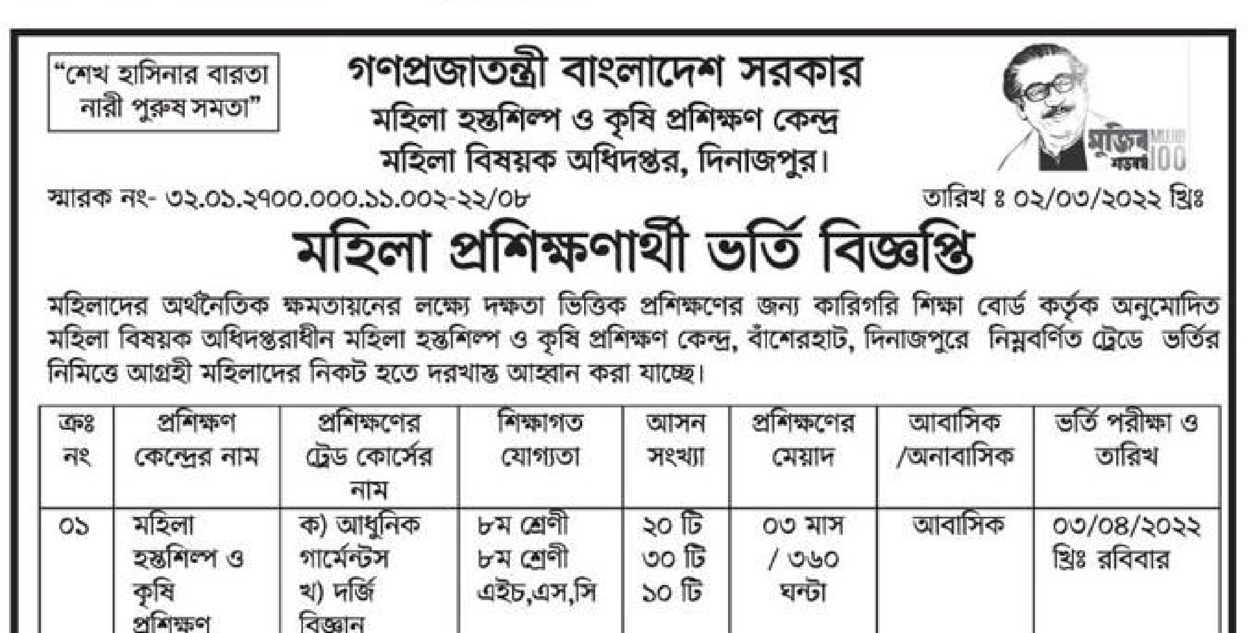 মহিলা প্রশিক্ষণার্থী ভর্তি বিজ্ঞপ্তি ২০২২ঃ মহিলা প্রশিক্ষণার্থী ভর্তি বিজ্ঞপ্তি ২০২২ প্রকাশ করেছে। মহিলাদের অর্থনৈতিক ক্ষমতায়নের লক্ষ্যে দক্ষতা ভিত্তিক প্রশিক্ষণের জন্য কারিগরি শিক্ষা বোর্ড কর্তৃক অনুমোদিত মহিলা বিষয়ক অধিদপ্তরাধীন মহিলা হস্তশিল্প ও কৃষি প্রশিক্ষণ কেন্দ্র, বাঁশেরহাট, দিনাজপুরে নিম্নবর্ণিত ট্রেডে ভর্তির নিমিত্তে আগ্রহী মহিলাদের নিকট হতে দরখাস্ত আহ্বান করা যাচ্ছে। মহিলা প্রশিক্ষণার্থী …