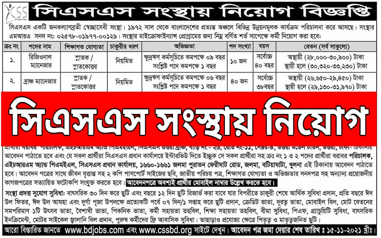 সিএসএস সংস্থায় নিয়োগ বিজ্ঞপ্তি ২০২১- CSS Job Circular 2021: সিএসএস সংস্থায় আবারও নিয়োগ বিজ্ঞপ্তি ২০২১ প্রকাশ করেছে। সিএসএস একটি জনকল্যাণব্রতী স্বেচ্ছাসেবী সংস্থা। ১৯৭২ সাল থেকে বাংলাদেশের প্রত্যন্ত অঞ্চলে বিভিন্ন উন্নয়নমূলক কার্যক্রম পরিচালনা করে আসছে। সংস্থার এমআরএ সনদ নংঃ ০২৫৭৮-০১৯৭৭-০০১২৯। সংস্থার মাইক্রোফাইন্যান্স প্রোগ্রামের জন্য নিম্ন বর্ণিত শর্ত সাপেক্ষে কর্মী নিয়োগ করা …