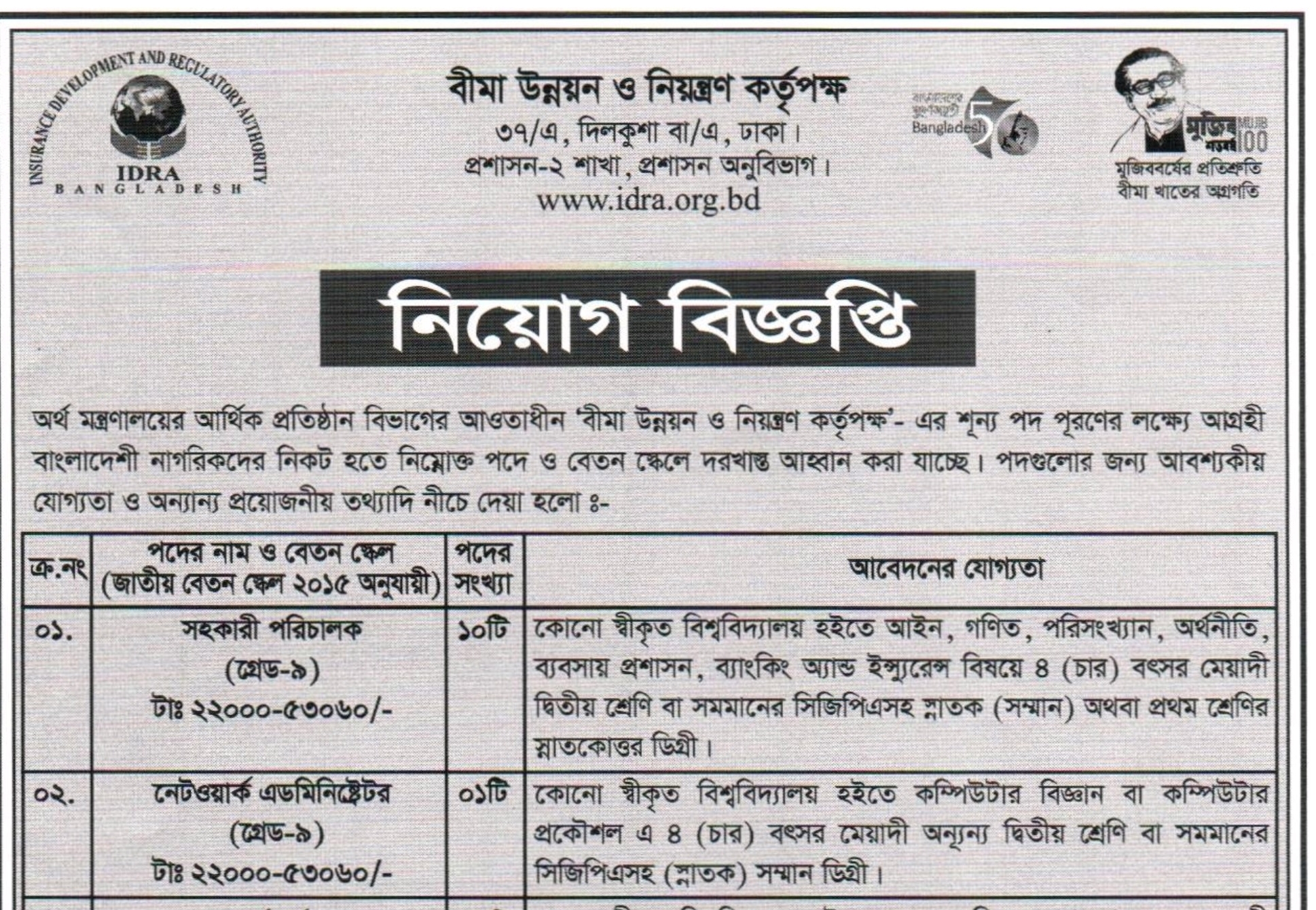 Read More »বীমা উন্নয়ন ও নিয়ন্ত্রন কর্তৃপক্ষ নিয়োগ বিজ্ঞপ্তি ২০২১ | IDRA Job Circular