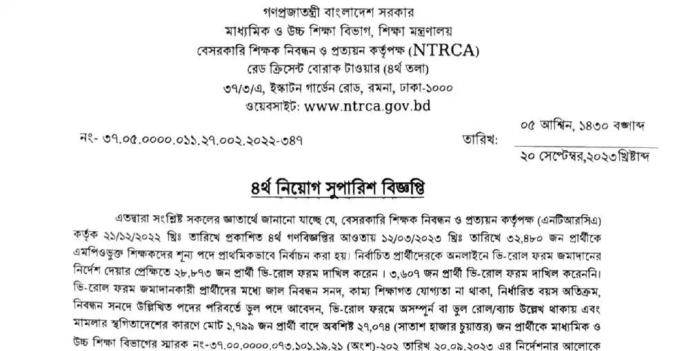 Read More »NTRCA ৪র্থ নিয়োগ সুপারিশ বিজ্ঞপ্তি ২০২৩