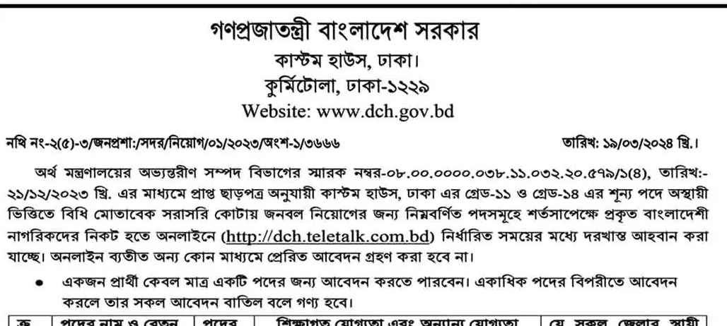কাস্টম হাউস ঢাকা নিয়োগ বিজ্ঞপ্তি ২০২৪ -(Custom House Dhaka DCH Job Circular 2024): নিয়োগ বিজ্ঞপ্তিতে ০৩ জনকে নিয়োগ দিবে কাস্টম হাউস ঢাকা। অর্থ মন্ত্রণালয়ের অভ্যন্তরীণ সম্পদ বিভাগের স্মারক নম্বর-০৮.০০.০০০০.০৩৮.১১.০৩২.২০.৫৭৯/১(৪), তারিখ:- ২১/১২/২০২৩ খ্রি. এর মাধ্যমে প্রাপ্ত ছাড়পত্র অনুযায়ী কাস্টম হাউস, ঢাকা এর গ্রেড-১১ ও গ্রেড-১৪ এর শূন্য পদে অস্থায়ী ভিত্তিতে বিধি মোতাবেক সরাসরি কোটায় জনবল নিয়োগের জন্য নিম্নবর্ণিত পদসমূহে শর্তসাপেক্ষে প্রকৃত বাংলাদেশী নাগরিকদের নিকট হতে অনলাইনে (http://dch.teletalk.com.bd) নির্ধারিত সময়ের মধ্যে দরখাস্ত আহবান করা যাচ্ছে। অনলাইন ব্যতীত অন্য কোন মাধ্যমে প্রেরিত আবেদন গ্রহণ করা হবে না।