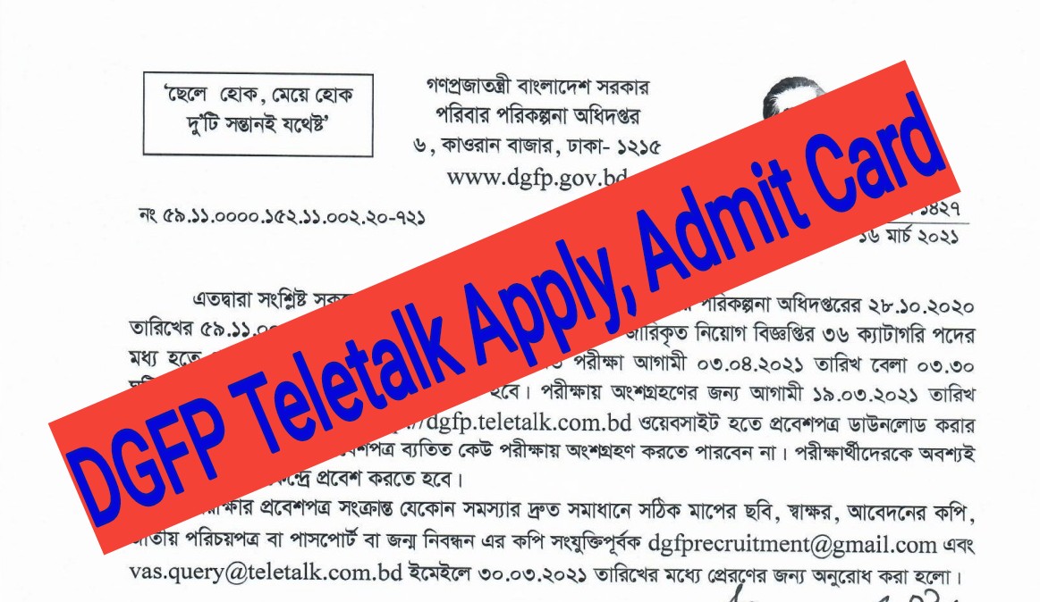 থেকে পরীক্ষার পূর্ব দিন পর্যন্ত dgfp.teletalk.com.bd ওয়েবসাইট হতে প্রবেশপত্র ডাউনলােড করার জন্য অনুরােধ করা হলাে। প্রবেশপত্র ব্যতিত কেউ পরীক্ষায় অংশগ্রহণ করতে পারবেন না। পরীক্ষার্থীদেরকে অবশ্যই মাদ্ক পরিধান করে কেন্দ্রে প্রবেশ করতে হবে।