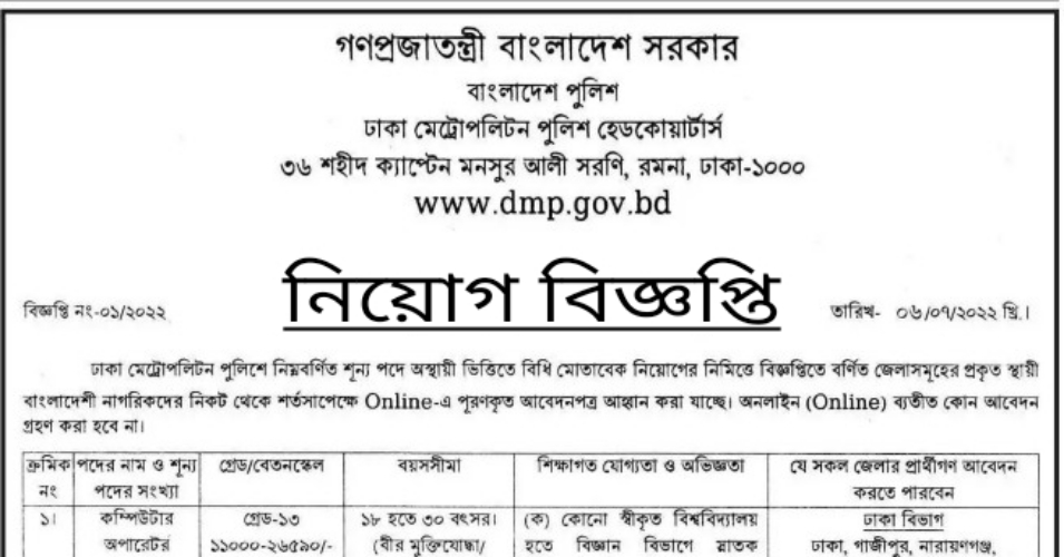 ঢাকা মেট্রোপলিটন পুলিশ হেডকোয়ার্টার্স নিয়োগ বিজ্ঞপ্তি ২০২২ঃ ঢাকা মেট্রোপলিটন পুলিশে নিম্নবর্ণিত শূন্য পদে অস্থায়ী ভিত্তিতে বিধি মোতাবেক নিয়োগের নিমিত্তে বিজ্ঞপ্তিতে বর্ণিত জেলাসমূহের প্রকৃত স্বাধী বাংলাদেশী নাগরিকদের নিকট থেকে শর্তসাপেক্ষে Online- পূরণকৃত আবেদনপত্র আহ্বান করা যাচ্ছে। অনলাইন (Online) বাতীত কোন আবেদন করা হবে না।