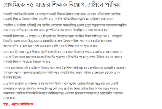 সহকারী শিক্ষকের ৩২ হাজার ৫৭৭ টি শূন্যপদে নিয়োগের জন্য প্রাথমিক শিক্ষা অধিদপ্তর গত ২০ অক্টোবর বিজ্ঞপ্তি প্রকাশ করে। কিন্তু করোনা মহামারীর কারণে নিয়োগ পরীক্ষা গ্রহণ সম্ভব হয়নি। ইতোমধ্যে অবসরজনিত কারণে আরও দশ হাজারেরও বেশি সহকারী শিক্ষকের পদ শূন্য হয়েছে।
