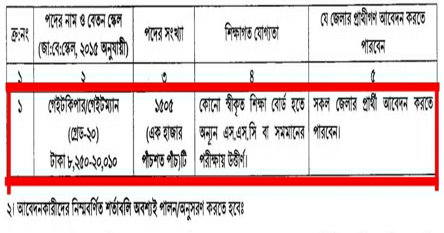 আবেদনকারীদের নিম্নবর্ণিত শর্তাবলি অবশ্যই পালন/অনুসরণ করতে হবেঃ আবেদনকারীদের আবশ্যিকভাবে কমপক্ষে ২ (দুই) বছর বাংলাদেশ রেলওয়ের প্রকল্পে গেইটকিপার/গেইটম্যান হিসাবে চাকুরীর অভিজ্ঞতা থাকতে হবে। যথাযথ প্রক্রিয়ায় নিয়োগের মাধ্যমে চাকুরীকালীন সময় নিরবিছিন্ন হতে হবে। আবেদনপত্রের সাথে অভিজ্ঞতার সনদ এবং যথাযথ প্রমাণক দাখিল করতে হবে যা মহাব্যবস্থাপক (পূর্ব/পশ্চিম), বাংলাদেশ রেলওয়ে কর্তৃক প্রত্যায়িত হতে হবে অন্যথায় আবেদন বাতিল বলে গণ্য হবে।