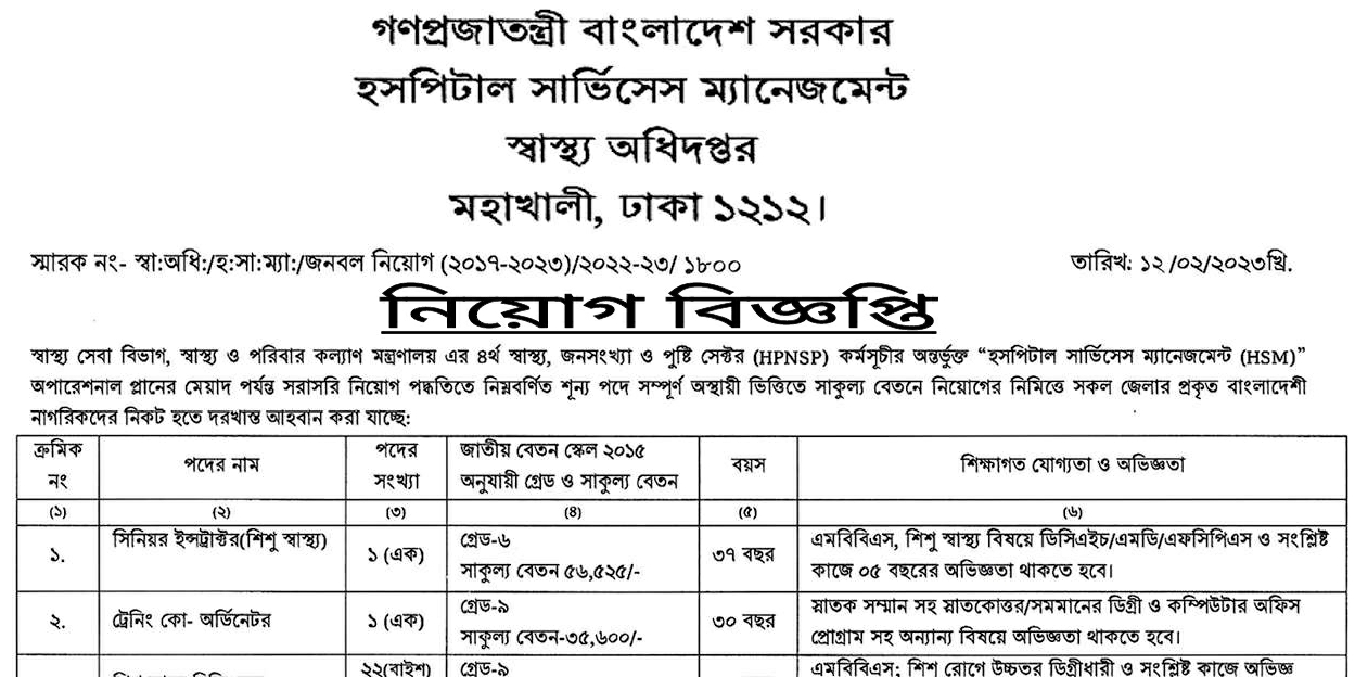 হাসপাতাল পরিষেবা ব্যবস্থাপনা এইচএসএম চাকরির বিজ্ঞপ্তি 2023 স্বাস্থ্য পরিষেবা বিভাগ, স্বাস্থ্য ও পরিবার কল্যাণ মন্ত্রক 4র্থ, স্বাস্থ্য, জনসংখ্যা এবং পুষ্টি সেক্টর (এইচপিএনএসপি) প্রোগ্রাম “হাসপিটাল সার্ভিসেস ম্যানেজমেন্ট (এইচএসএম)” অপারেশনাল প্ল্যানের অন্তর্ভুক্ত নিম্নলিখিত শূন্য পদগুলিতে সরাসরি নিয়োগের জন্য সকল জেলায় পূর্ণ অস্থায়ী ভিত্তিতে বেতনের ভিত্তিতে প্রকৃত বাংলাদেশী নাগরিকদের কাছ থেকে অনলাইনে দরখাস্ত আহ্বান করা হচ্ছে।