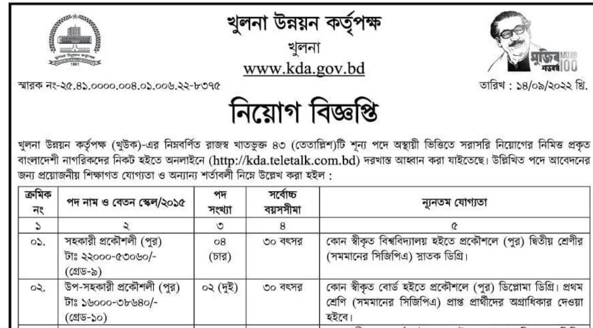খুলনা উন্নয়ন কর্তৃপক্ষ নিয়োগ বিজ্ঞপ্তি ২০২২ -(Khulna Development Authority KDA Job Circular 2022): খুলনা উন্নয়ন কর্তৃপক্ষ (খুউক)-এর নিম্নবর্ণিত রাজস্ব খাতভুক্ত ৪৩ (তেতাল্লিশ)টি শূন্য পদে অস্থায়ী ভিত্তিতে সরাসরি নিয়োগের নির্মিত প্রকৃত বাংলাদেশী নাগরিকদের নিকট হইতে অনলাইনে (http://kda.teletalk.com.bd) দরখাস্ত আহ্বান করা যাইতেছে।