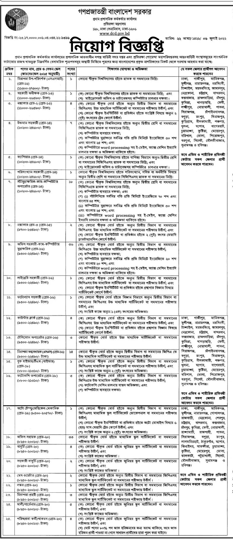 প্রতিরক্ষা মন্ত্রণালয়ের রাজস্ব খাতভুক্ত নিম্নবর্ণিত শূন্যপদসমূহ অস্থায়ী ভিত্তিতে পুরণের জন্য বাংলাদেশের প্রকৃত নাগরিকদের নিকট থেকে দরখাস্ত আহ্বান করা যাচ্ছে।