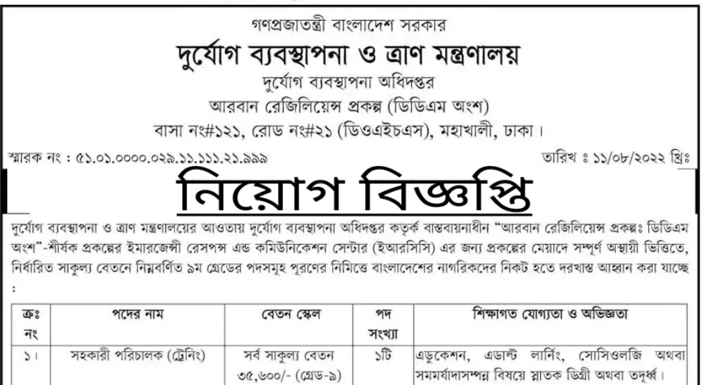 দুর্যোগ ব্যবস্থাপনা ও ত্রাণ মন্ত্রণালয় নিয়োগ বিজ্ঞপ্তি ২০২২ঃ দুর্যোগ ব্যবস্থাপনা ও ত্রাণ মন্ত্রণালয়ের আওতায় দুর্যোগ ব্যবস্থাপনা অধিদপ্তর কর্তৃক বাস্তবায়নাধীন “আরবান রেজিলিয়েন্স প্রকল্পঃ ডিডিএম অংশ”-শীর্ষক প্রকল্পের ইমারজেন্সী রেসপন্স এন্ড কমিউনিকেশন সেন্টার (ইআরসিসি) এর জন্য প্রকল্পের মেয়াদে সম্পূর্ণ অস্থায়ী ভিত্তিতে, নির্ধারিত সাকুল্য বেতনে নিম্নবর্ণিত ৯ম গ্রেডের পদসমূহ পূরণের নিমিত্তে বাংলাদেশের নাগরিকদের নিকট হতে দরখাস্ত আহ্বান করা যাচ্ছে।