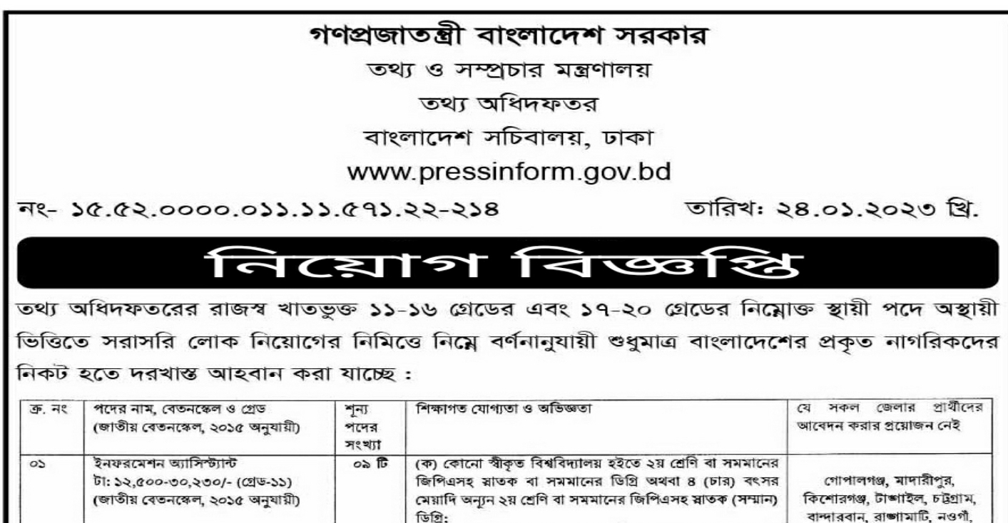 প্রেস ইনফরমেশন ডিপার্টমেন্ট পিআইডি জব সার্কুলার 2023 তথ্য অধিদপ্তর কর্তৃক 45 জনকে নিয়োগ দেওয়া হবে। তথ্য অধিদপ্তরের রাজস্ব খাতের অধীনে 11-16 গ্রেড এবং 17-20 গ্রেডের নিম্নলিখিত স্থায়ী পদে অস্থায়ী ভিত্তিতে লোকেদের সরাসরি নিয়োগের জন্য নীচের বর্ণনা অনুযায়ী শুধুমাত্র বাংলাদেশের প্রকৃত নাগরিকদের কাছ থেকে দরখাস্ত আহ্বান করা হচ্ছে।
