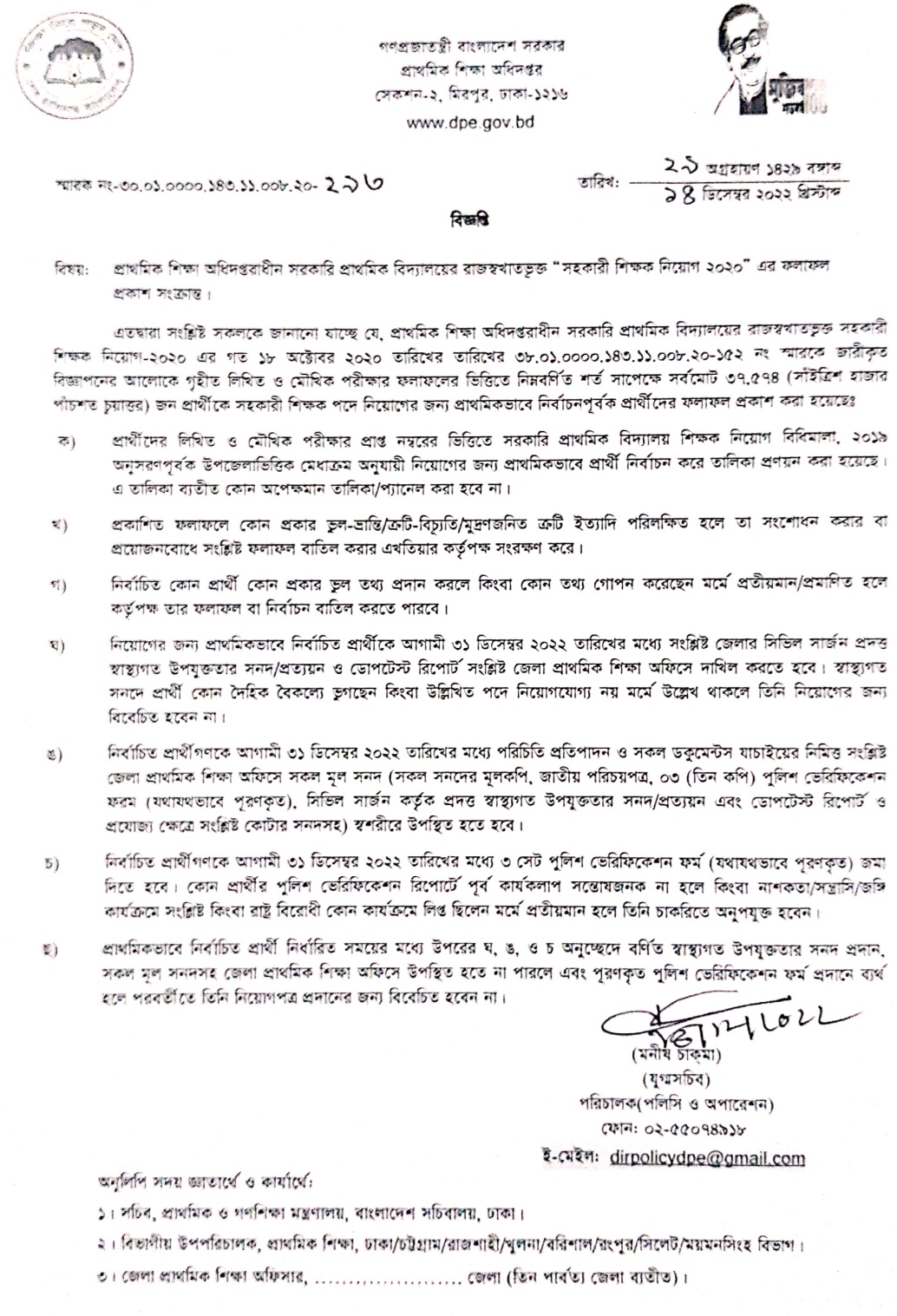 কোন প্রার্থী ইচ্ছাকৃতভাবে কোন ভুল তথ্য প্রদান করলে কিংবা কোন তথ্য গোপন করেছেন মর্মে প্রতীয়মান/ প্রমাণিত হলে কর্তৃপক্ষ তার ফলাফল বা নির্বাচন বাতিল করতে পারবে। প্রার্থীদের লিখিত পরীক্ষায় প্রাপ্ত নম্বর ও মৌখিক পরীক্ষায় প্রাপ্ত নম্বরের ভিত্তিতে ‘সরকারি প্রাথমিক বিদ্যালয় শিক্ষক নিয়োগ বিধিমালা, ২০২০’ অনুসরণপূর্বত নিয়োগের জন্য চূড়ান্তভাবে প্রার্থী নির্বাচন করা হবে। মৌখিক পরীক্ষার স্থান, তারিখ ও সময় পরবর্তীতে যথাসময়ে প্রার্থীদের জানানো হবে। মৌখিক পরীক্ষার জন্য নির্বাচিত প্রার্থীদের রোল নম্বর ক্রমানুসারে এতদসঙ্গে প্রদত্ত হলো।