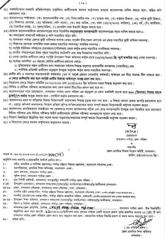 চেয়ারম্যান, বান্দরবন পার্বত্য জেলা পরিষদ বরাবর স্ব-হস্তে লিখিত/পূরণকৃত সরকারি চাকরি আবেদনপত্র আগামী ১২/০৫/২০২২ খ্রিঃ তারিখের বিকাল । ৫.০০ টার মধ্যে অফিস চলাকালীন সময়ে বান্দরবান পার্বত্য জেলা পরিষদ কার্যালয়ে পৌঁছাতে হবে। উক্ত তারিখ/সময়ের পরে সরাসরি ডাকযোগে বা অন্যকোন উপায়ে প্রাপ্ত দরখাপ্ত গ্রহণ করা হবেনা।