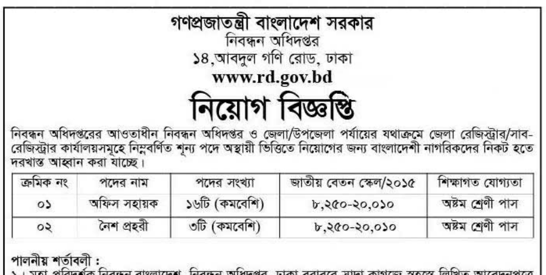 নিবন্ধন অধিদপ্তর নিয়োগ বিজ্ঞপ্তি